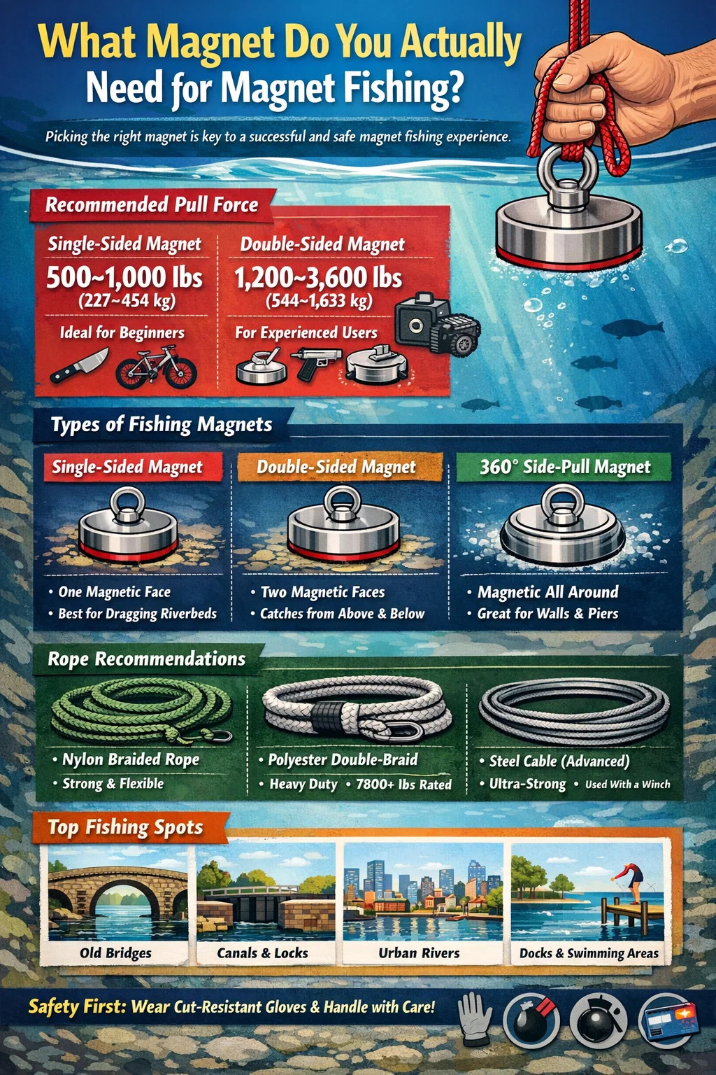 Det korte svar: for de fleste begyndere, en enkeltsidet neodymmagnet med 500-1.000 lbs (227-454 kg) trækkraft er det ideelle udgangspunkt for magnetfiskeri. Den er stærk nok til at hente knive, værktøj, cykler og endda pengeskabe fra floder og søer, men alligevel håndterbar nok til at håndtere sikkert uden specialudstyr. Hvis du er mere erfaren eller målretter mod tungere genstande på dybt vand, bliver en dobbeltsidet magnet i området 1.200–3.600 lb det bedste valg.
