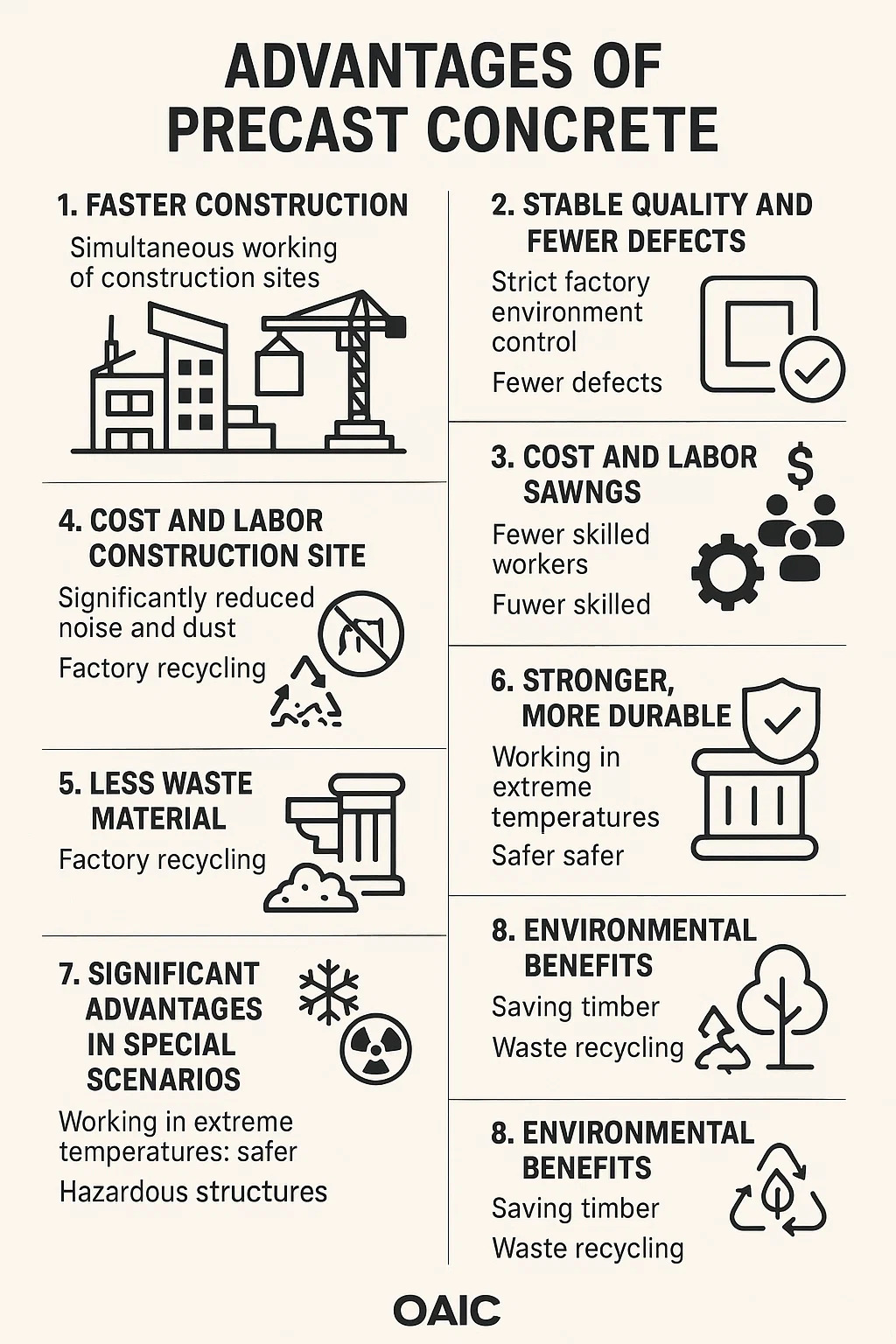 Montering på stedet er som byggeklodser: Præfabrikeret beton hejses direkte til stedet, hvilket sparer tid brugt på forskalling, armeringsjernbinding og ventetid på, at betonen stivner.