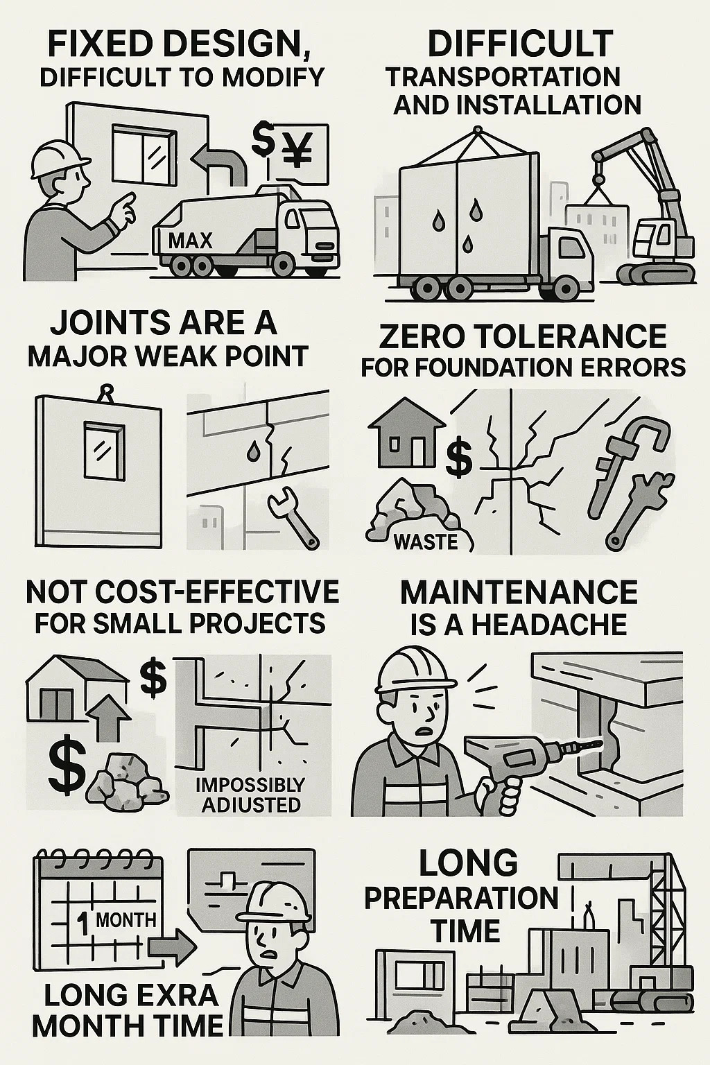 Her er nogle almindelige ulemper ved præfabrikeret beton i praktiske anvendelser: