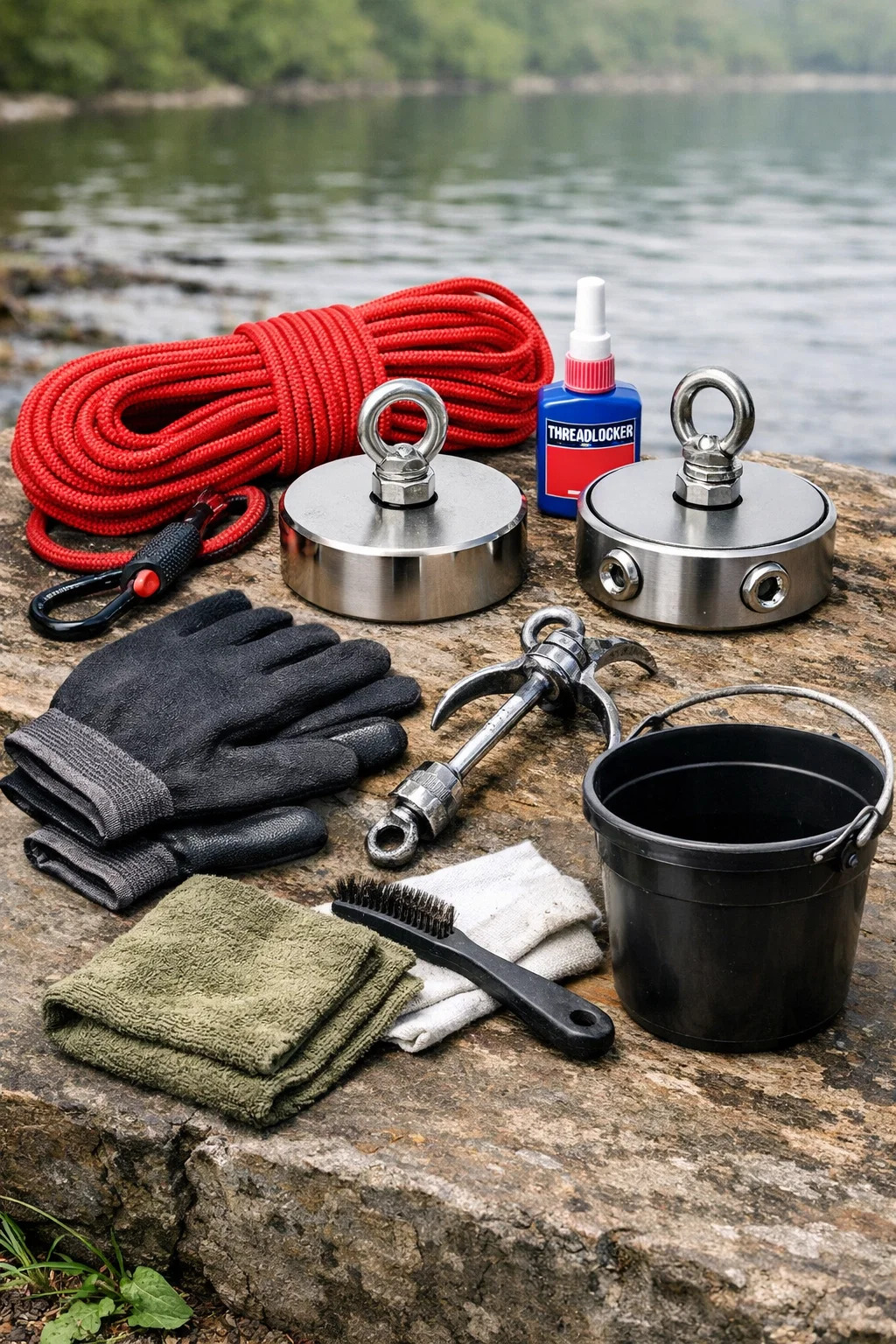 Sådan vælger du: Du skal bruge en dedikeret fiskemagnet med et stålhus til beskyttelse. Disse magneter har normalt en metalring til sikkert at fastgøre rebet.
