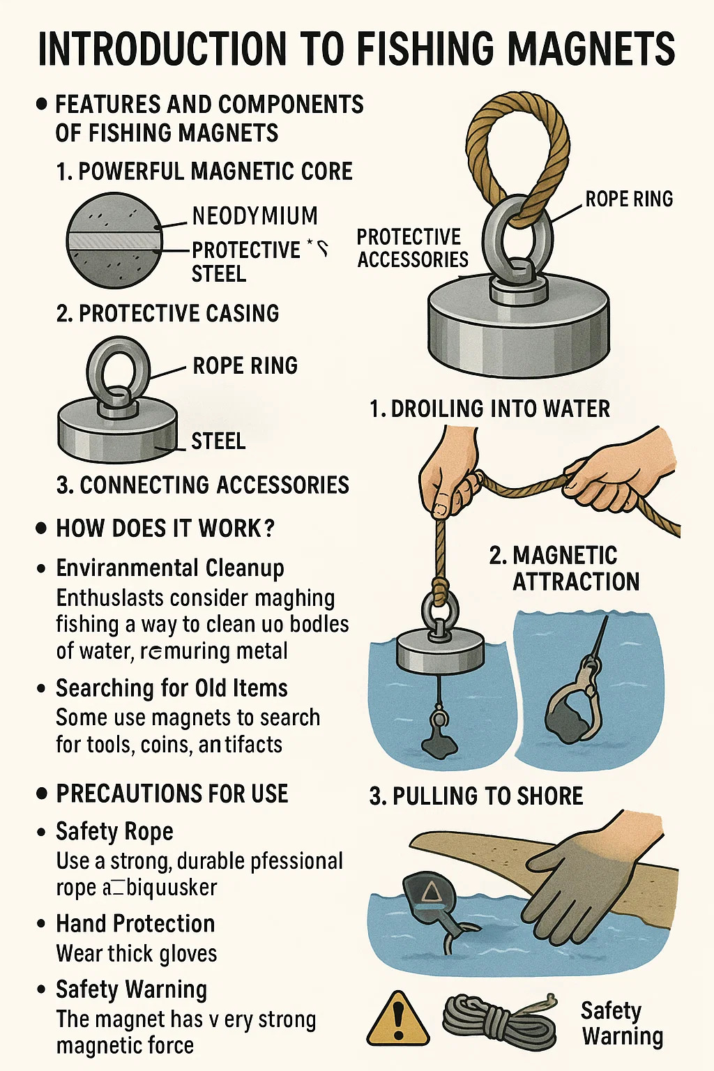 En fiskemagnet er, som navnet antyder, et kraftfuldt magnetisk værktøj, der bruges til at "fiske" efter jernholdige genstande i bunden af vandmasser eller på svært tilgængelige steder. Den bruger stærk magnetisk kraft til at tiltrække og hente metalgenstande og erstatter traditionelle kroge og liner.