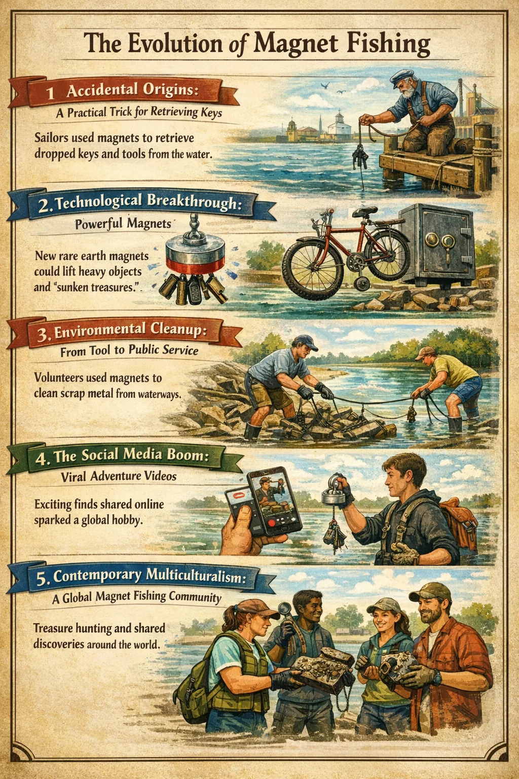 Der er ikke et præcist historisk øjeblik for opfindelsen af magnetfiskeri, som opfindelsen af pæren. I stedet udviklede det sig gradvist fra et praktisk life hack til en globalt populær udendørs hobby.