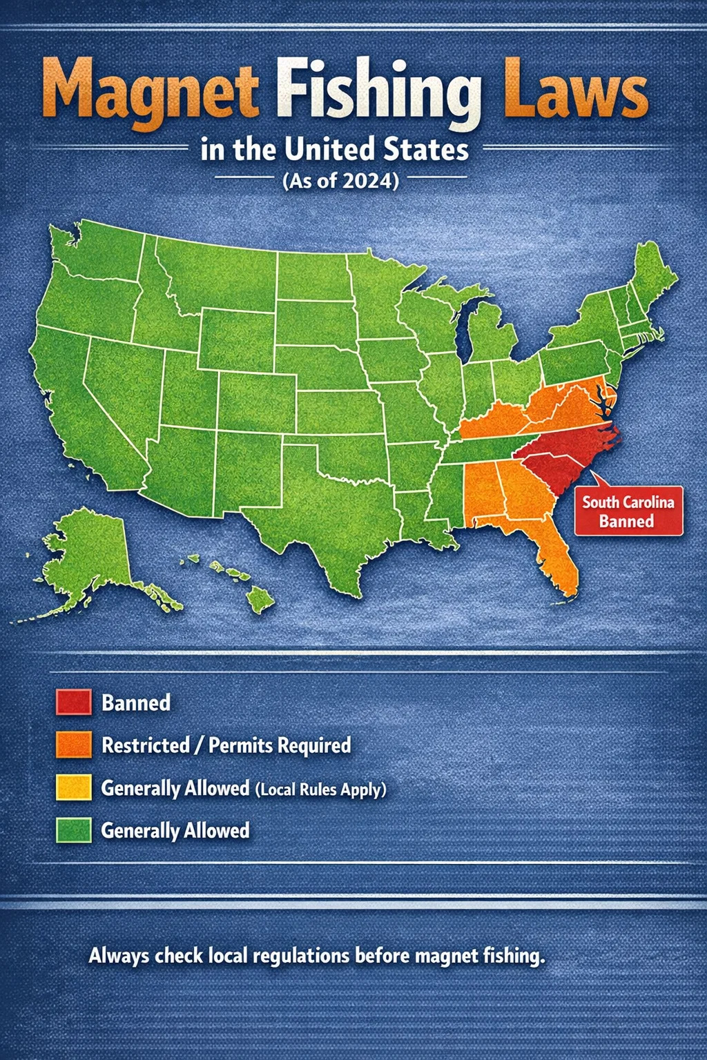 Størstedelen af amerikanske stater tillader i øjeblikket magnetfiskeri uden et specifikt forbud på statsniveau. Fra 2024, kun South Carolina har et eksplicit statsdækkende forbud mod magnetfiskeri , hvilket gør det til den ene klare afviger. Men "tilladt som standard" betyder ikke ubegrænset. Dusinvis af stater har vandvejsbestemmelser, tilladelseskrav eller lokale forordninger, der direkte påvirker, hvor og hvordan du kan bruge en fiskemagnet. Før du binder en neodymmagnet til et reb og taber den i en flod, skal du forstå ikke kun statens lovgivning, men også amtets regler, jordejerskab og den specifikke vandmasse, du målretter mod.