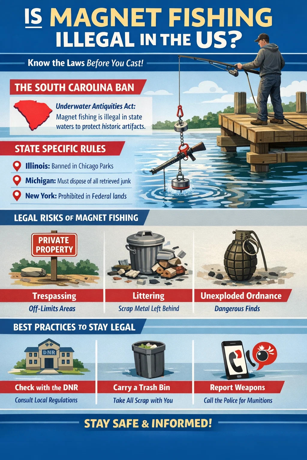 Magnet fiskeri er ikke ulovligt på føderalt niveau i USA, men det er strengt reguleret eller direkte forbudt i specifikke stater, byer og jurisdiktioner. Det mest bemærkelsesværdige forbud er i South Carolina , hvor undersøiske oldsagsloven forbyder anvendelse af en fiskemagnet at indsamle artefakter fra statsfarvande. I andre stater afhænger lovligheden af lokale overtrædelseslove, miljøbeskyttelse og mandater fra Department of Natural Resources (DNR).